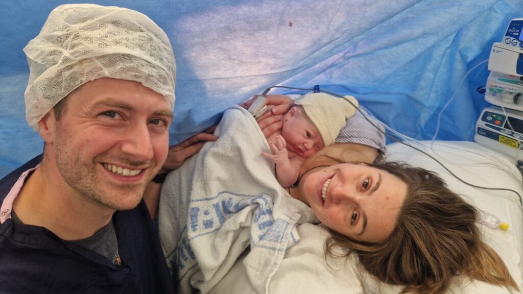 Birth was eventful, Claire was induced and her waters were broken at 40+11. It went pretty fast from there but Teddy was struggling and labour wasn’t progressing, so we ended up with a 4am C-section. It was actually a real party-like atmosphere when we had the section and the staff made it feel very special. It was strange for Claire being on the other side of the drapes having worked in that same theatre previously.