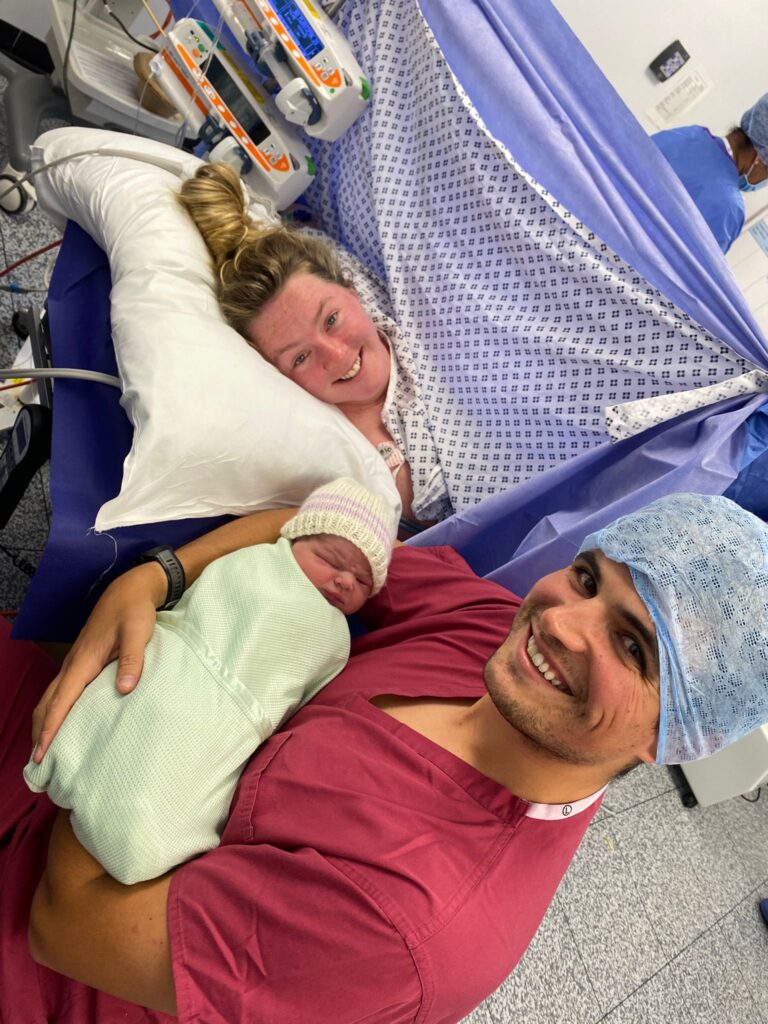 Due to the C-section we were told that often babies can take some time to cry. However she cried straight away and I cried instantly. It was the most magical sound ever. They brought her round the curtain so we could see her straight away and I had an overwhelm of emotions. Me and my husband were both shaking with adrenaline and we couldn’t believe we were parents to this little baby!