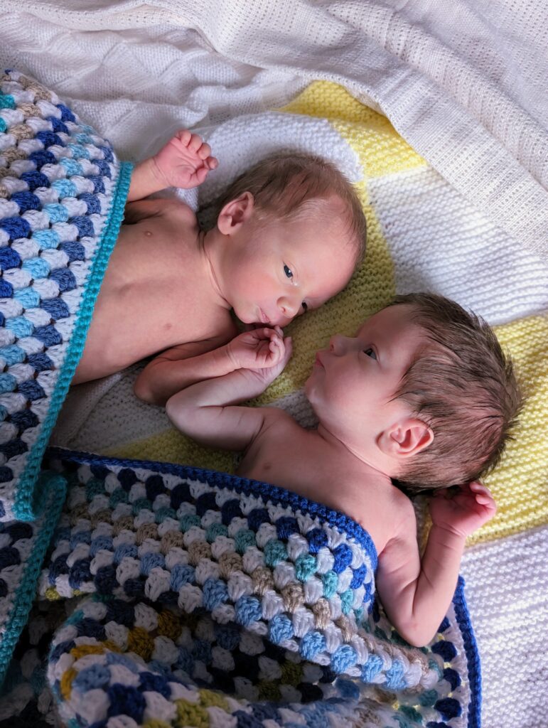 My birth was unexpected – the boys were 6 weeks early as I was admitted to hospital with severe pre-eclampsia and had an unplanned C-section on the same day. To be honest I was relieved to have a c-section despite planning potentially for both scenarios (vaginal or C-section) but it was a sudden scary time. I knew I was in the right place to be cared for and it was good to know the symptoms I was feeling were beyond the norm for pregnancy! My birth bag was semi ready and we had thrown it on the bed in preparation just in case when we went to hospital so that someone could grab it for us if we needed it!